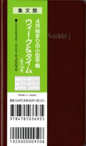 4月始まり。見開き2ページに月曜始まりの1週間の記入欄。週間ページは時間帯別記入欄に。カバーの色は茶。